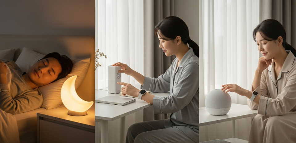 🔹 쉽게 잠들지 못하는 사람 → 멜라토닌 조명, 명상 사운드 기기 추천